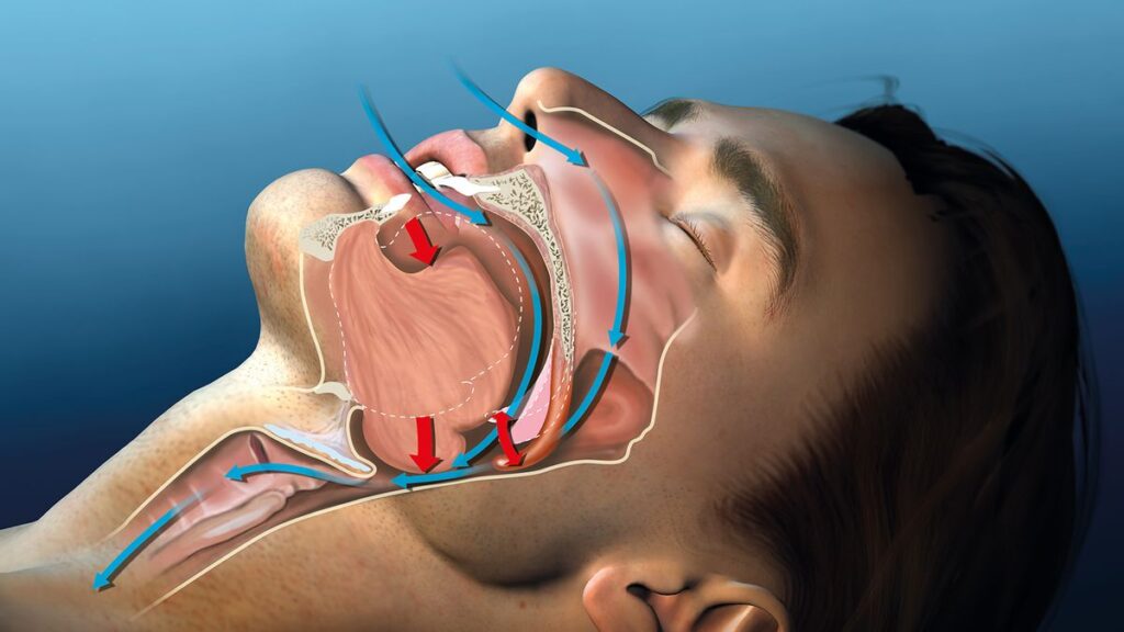 Snoring occurs when airflow through the nose or mouth is partially blocked during sleep, causing tissues in the throat and nasal passages to vibrate. The sound can range from soft to loud and may vary from night to night depending on sleeping position, nasal congestion, or alcohol intake.